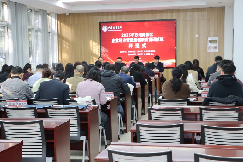 2025年11月24日上午,苏州高新区企业经济管理和创新发展研修班在中国矿业大学文昌校区顺利开班。苏州高新区经济发展委员会副书记徐晖、苏州高新区企业服务中心主任林展、中国矿业大学继续教育学院副院长王虎出席了开班仪式。