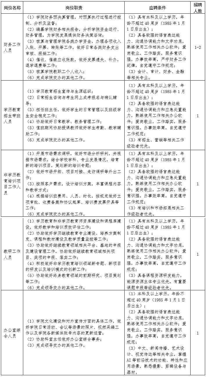应聘人员须政治立场正确,拥护党和国家的方针政策,遵守法律法规和学校的各项规章制度,同时具有岗位要求的素质能力,身心健康。招聘岗位、职责及应聘条件如下:
