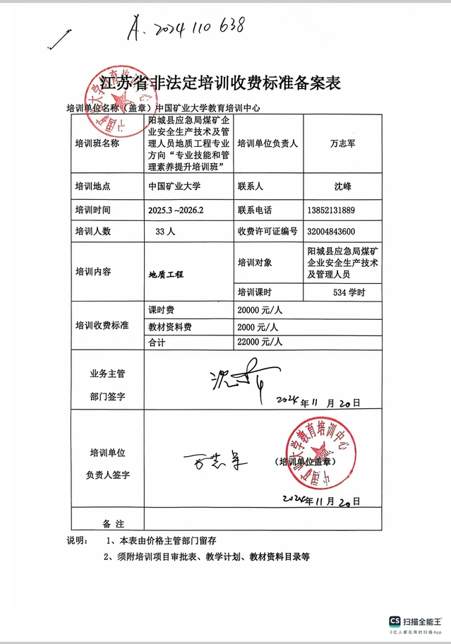 A2024110638-阳城县应急局煤矿企业安全生产技术及管理人员地质工程专业方向“专业技能和管理素养提升培训班”