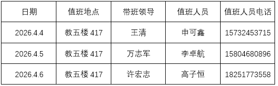 (一)放假期间,学校设24小时总值班室,地点在南湖校区行健楼A427室。学生工作处、保卫处、总务部设立分值班室,其中,学生工作处、保卫处24小时值班。值班电话如下: