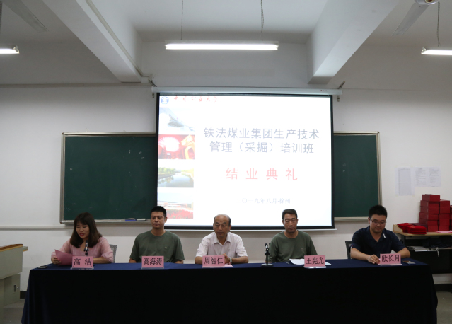 2019年8月7日上午,“铁法煤业集团生产技术管理(采掘)培训班”结业典礼在文昌校区举行。铁法煤业集团大兴矿生产副矿长王宪光,大隆矿生产副矿长高海涛,我校职业与继续教育部党委书记周智仁出席结业典礼。
