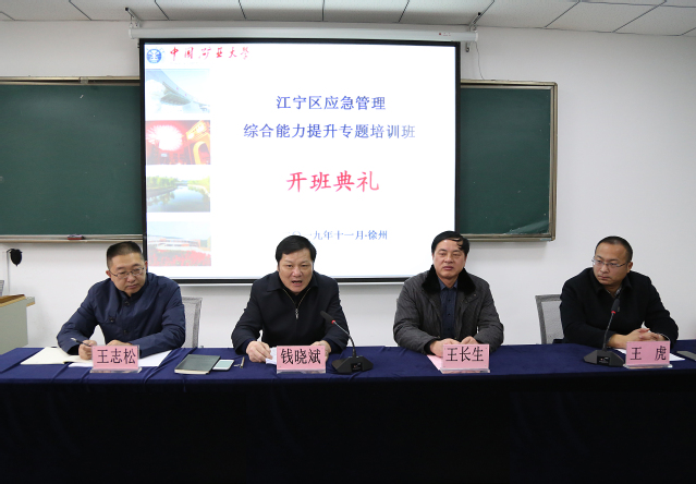 11月27日上午,由南京市江宁区应急管理局和我校联合举办的“江宁区应急管理综合能力提升专题培训班”在我校开班。江宁区应急管理局党组书记、局长钱晓斌,副调研员王志松,中国矿业大学职业与继续教育部部长王长生出席开班典礼。