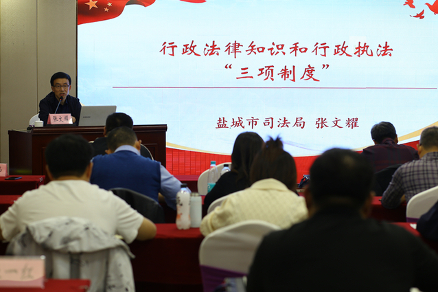 典礼结束之后,盐城市司法局行政执法协调监督处处长张文耀老师为学员作了“行政法律知识和行政执法‘三项制度’”的首场专题报告。